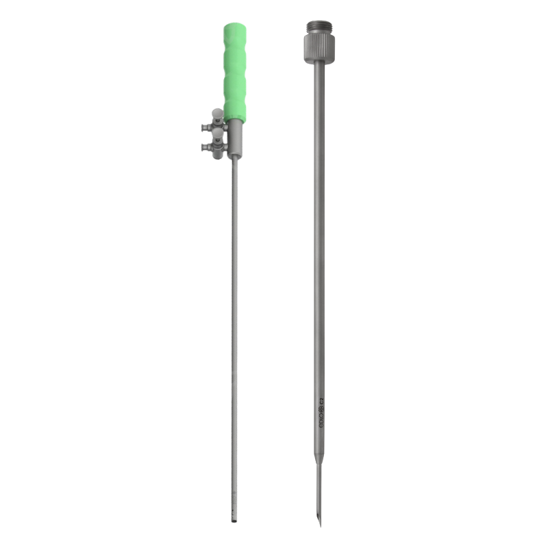 Cânula para punção e injeção de gases e líquidos, com agulha de 0,8 mm e comprimentos de 20 cm e 36 cm. Fabricada em aço inoxidável e autoclavável.